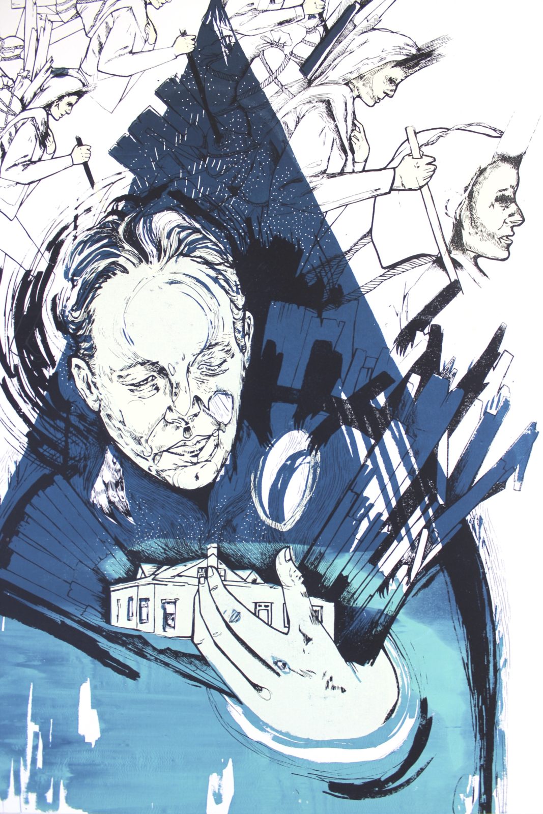 To shape the narrative elements of my work I fastidiously render the architectural and human faces of my community. I want to illustrate a dialogue between spaces and people as they change. These narratives often contain symbols of destruction, contemplation and consequence. I use repetition of these symbols in attempt to show both mental and physical movement and interaction. By using permanent material such as wood, linoleum or lithographic stone I am trying to make these connections durable and enduring.