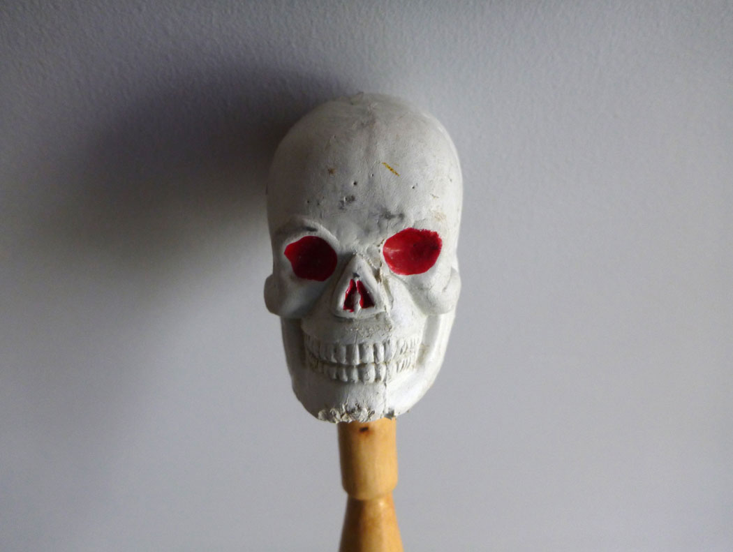 For this exhibition at the Craig Gallery, I am presenting a piece entitled “Drift and Flow.” The title refers to the psychogeographic practice of walking known as the “dérive” (or drift), and to mathematical concepts of randomness in genetic variation, from the study of heredity. I fashioned the walking stick after images of Charles Darwin’s whalebone and ivory walking stick on display at the Science Museum in London. The skull was a very popular form of “memento mori” seen in material culture from that period, and an effective reminder of mortality. In the round window is a Cytoscape image, a bioinformatic representing particular genetic expressions, interactions and networks.