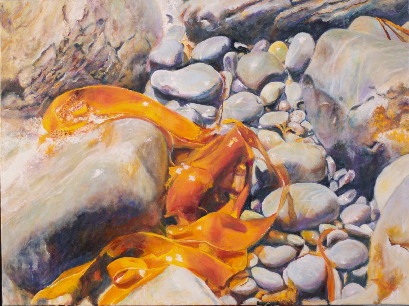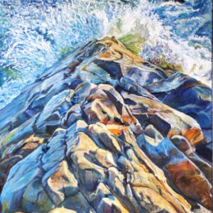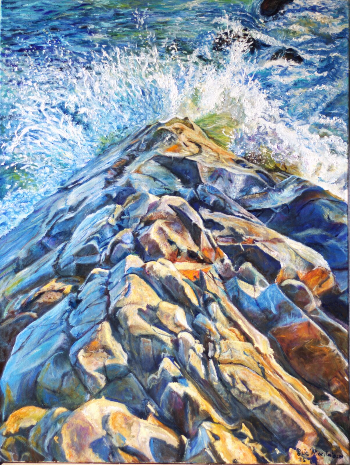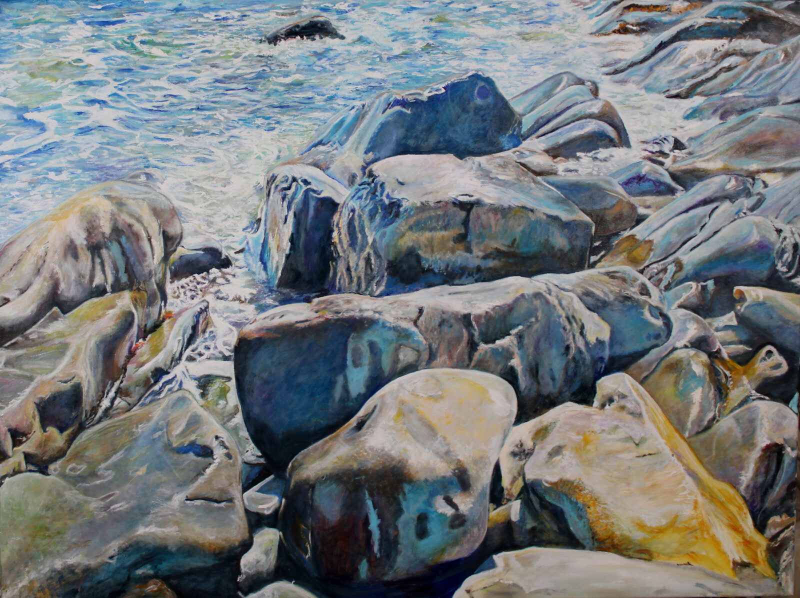 In my current work, I explore moments where land and sea meet, the translucency of multi-coloured rocks alternately bathed and pounded by the shallow water and how light is reflected on and off them in a chaotic burst of colour, movement and power.