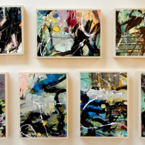 I primarily paint with fluid acrylics but I also use oil sticks, watercolours and printmaking tools.