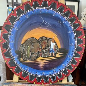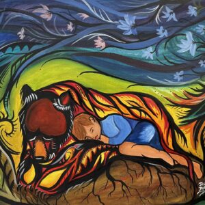 In her fine art practice, Jessica primarily worked in oil, and now creates with watercolour on canvas. Her imagery reflects her experiences as a Mi’kmaq woman, a mother, and a partner. They are often reflective, and poetic, and contain echoes of patterns unique to the Mi’kmaq people, and of the animals and traditional items that have continuing meaning.
