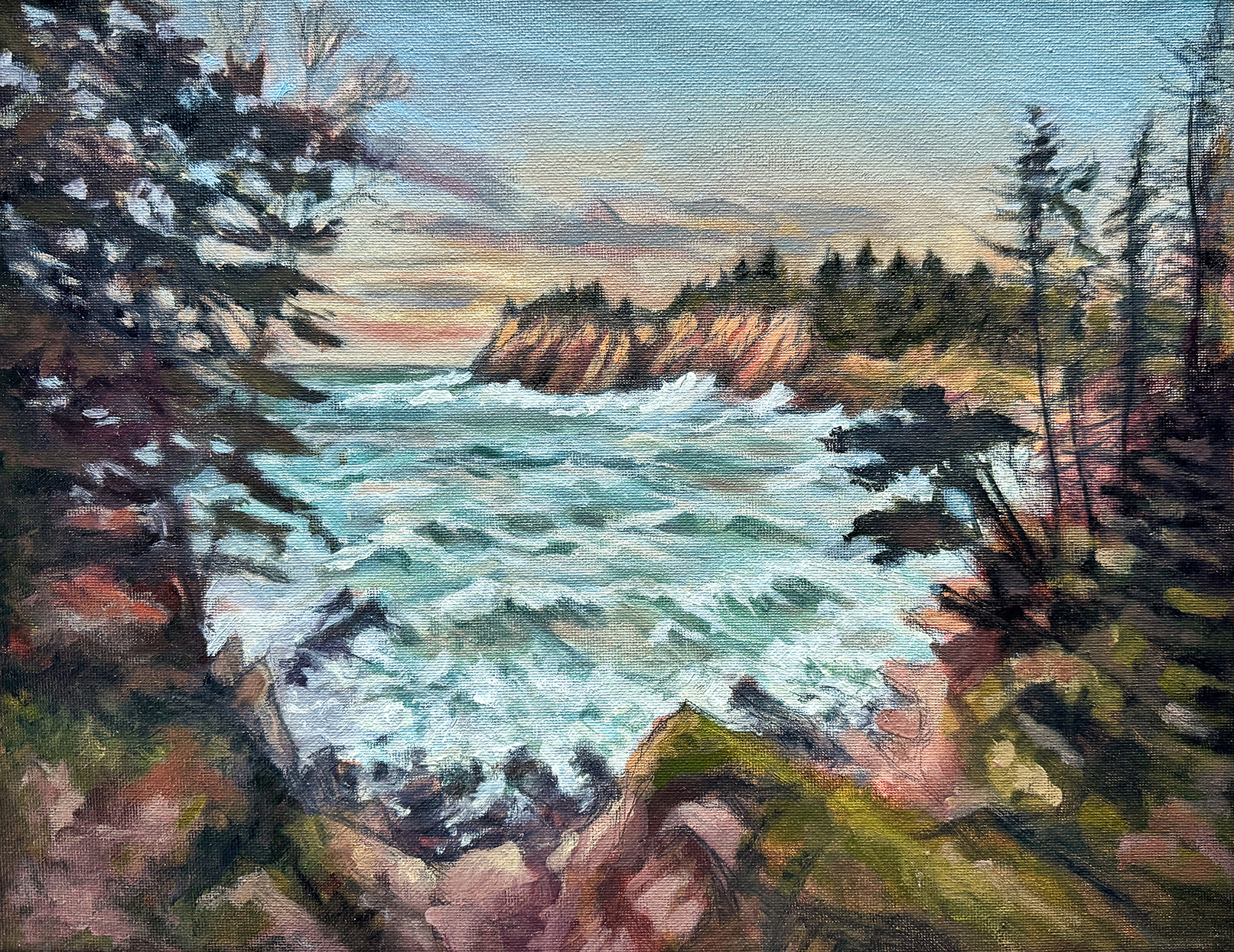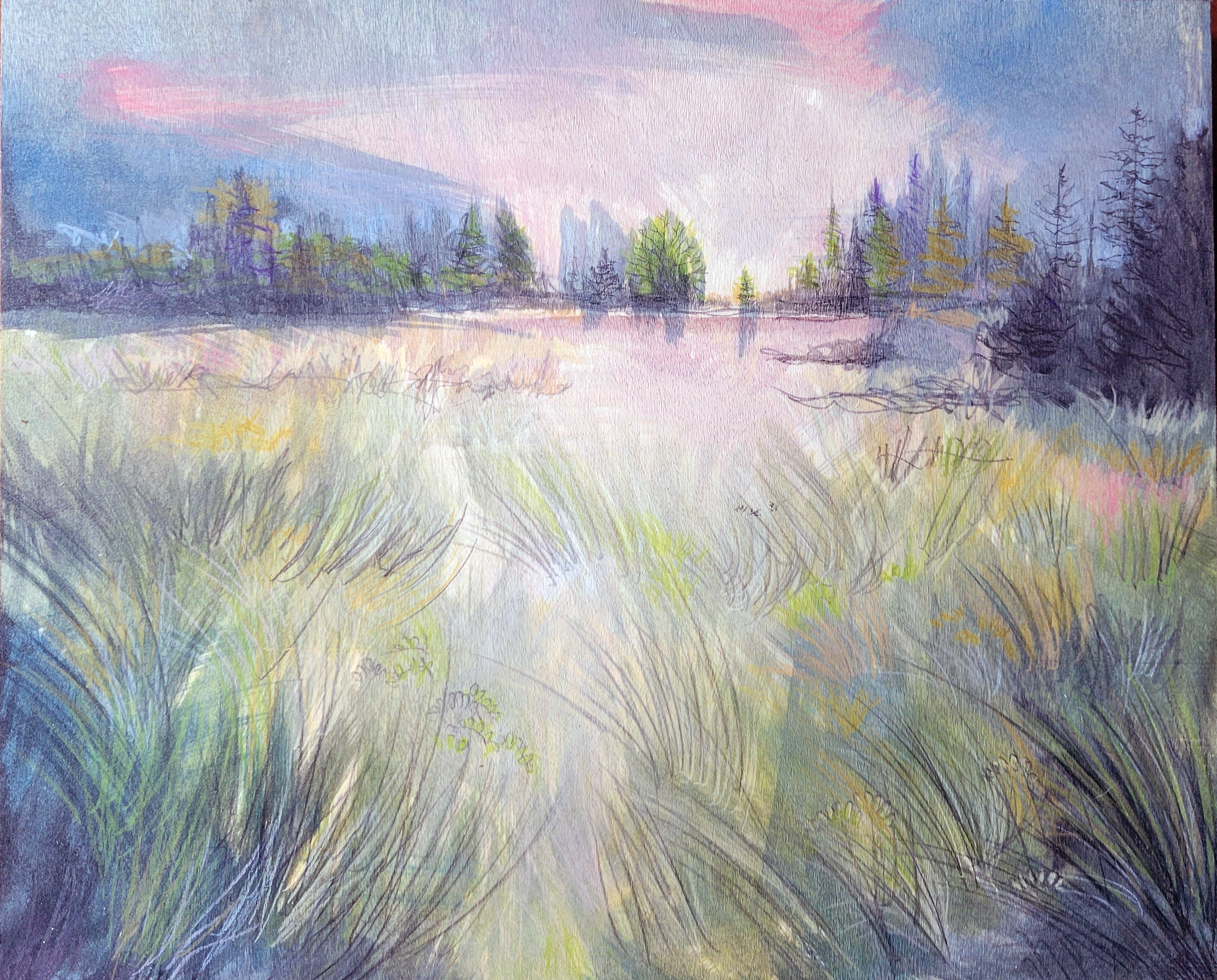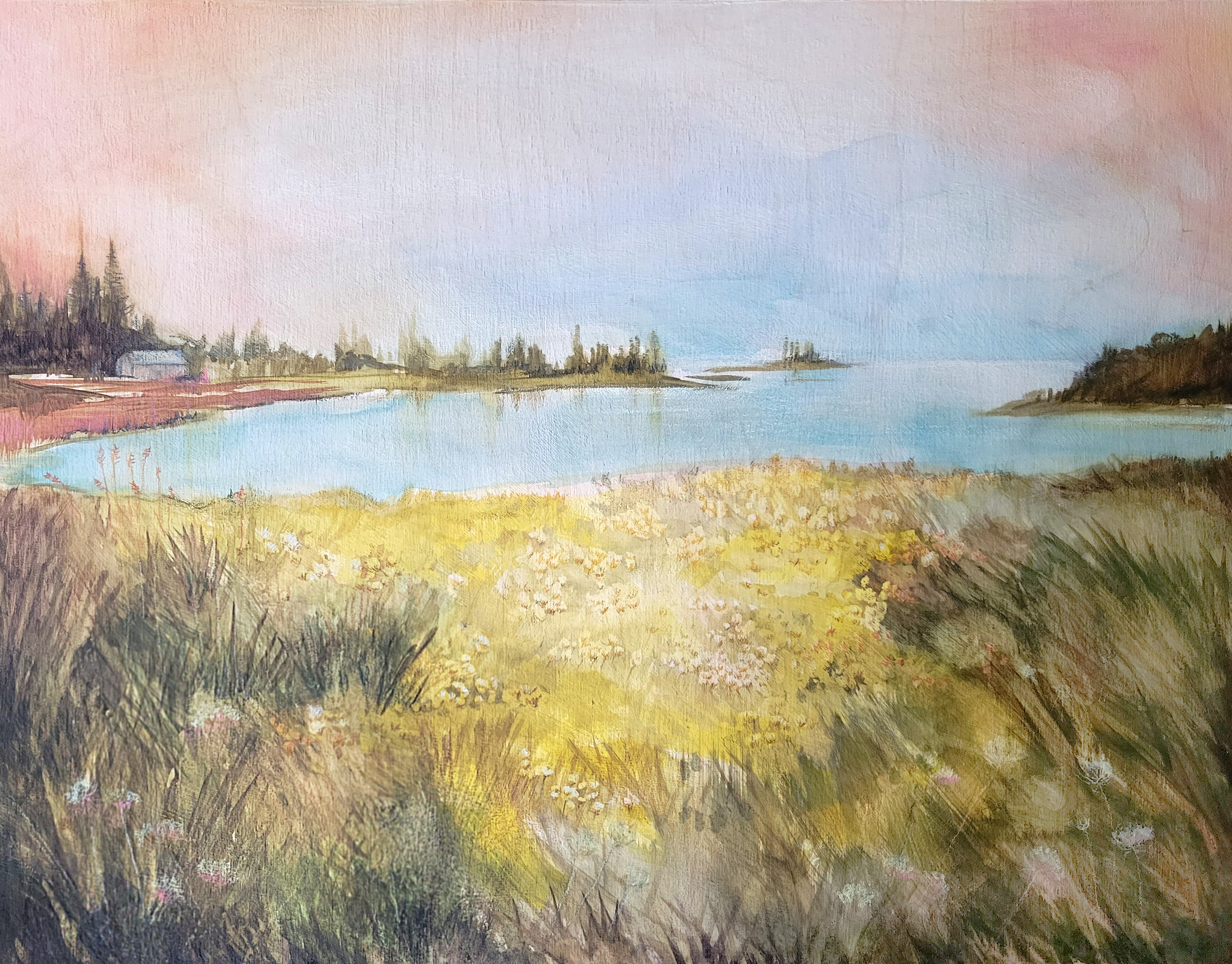 Living in Nova Scotia I am deeply moved by the landscapes. I feel the light, the colours and the smell of salt air and pine trees. I often take photos for reference but they never seem to capture all that I'm seeing or feeling. I've been working on ways to translate what is in my mind's eye into images so I can express the joy that I feel after being moved by the beauty of place. I have been manipulating my reference photos to enhance certain accepts and abstract others as a stepping stone to create ideas, to inform the marks I will make with my paint.