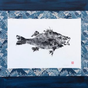 “While angling at the mouth of the Gaspereau River, N.S. I hooked and landed this bass (early August 2017). I practice catch and release but after 30 min of trying to revive the bass it was unsuccessful. To pay tribute to this magnificent catch I wanted to do something special so it was frozen until I determined what to do next. After talking with Rachel, she suggested trying Gyotaku, Japanese fish printing. After the fish printing process the bass was filleted and eaten.”