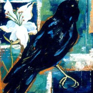 My paintings combine the crow and raven, floral arrangements, weather patterns, textile fragments, and references to past civilizations. The images are interwoven on canvas,appearing much like a collage of images, they are painted in oil and acrylic. Weather patterns denote devastation. Flowers add a long standing symbol of memorial, while the textile fragments come from scarves or pieces of cloth of personal significance. The combination of these elements is meant to offer a compelling homage to the common crow and raven.