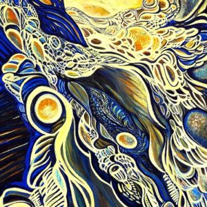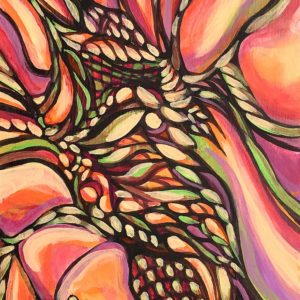 Teresa's handling of colours is quite unusual in their combinations and evokes a dynamic sense of movement, or even a watery wave-like feeling in it's abstract patterns.