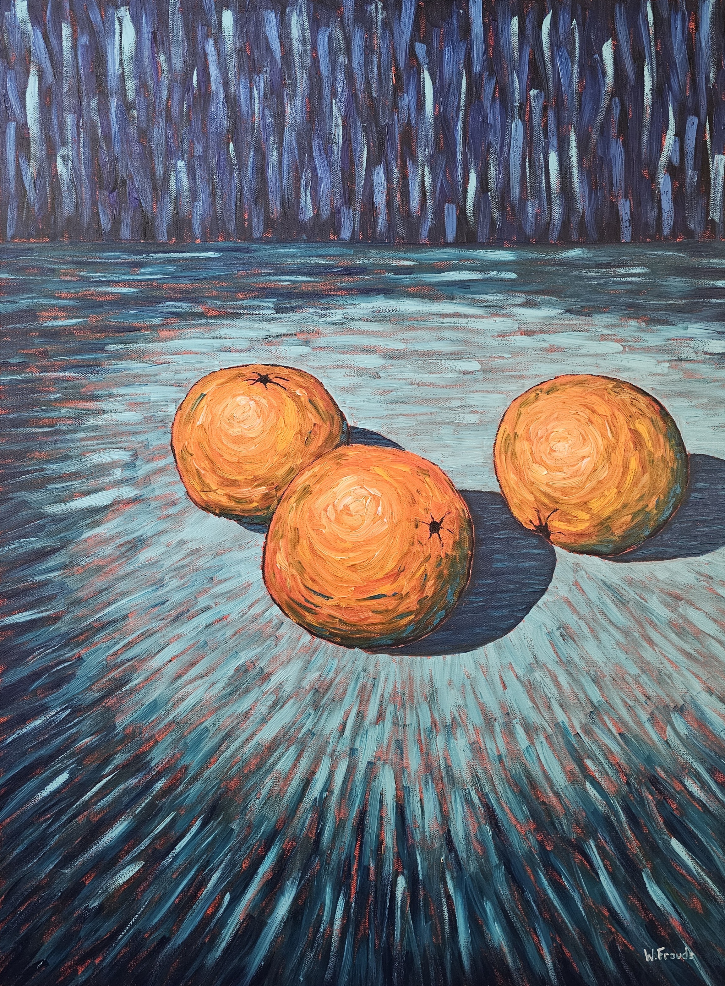 W. Froude is a self taught artist originally from Penetanguishene, Ontario, now living in East Lawrencetown, Nova Scotia. He works primarily in oil, along with watercolour and ink, creating landscapes, still life, and figurative pieces that explore the relationship between the natural and constructed world. Drawing on his experience as a millwright at the Halifax Shipyard, Froude brings a strong sense of structure and physicality to his work. His paintings are marked by bold colour, expressive brushwork, and a balance between spontaneity and control. His work has been exhibited in group shows across Nova Scotia, and collected privately internationally and domestically.