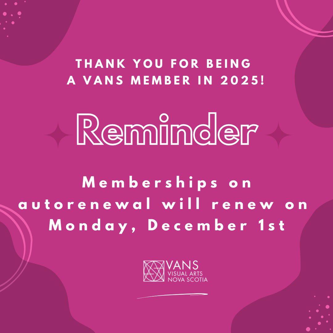 If you have questions or concerns about your autorenewing membership, please email Carri at communicate@visualarts.ns.ca.