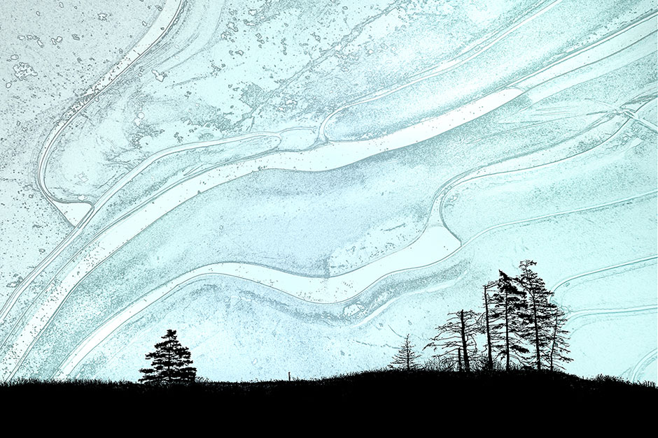 Frosted Aurora: a composite image created in December 2013 that combines photographs of silhouetted trees and an ice puddle from separate locations on Nova Scotia’s South Shore. It reminded me of the Northern lights in wintertime.